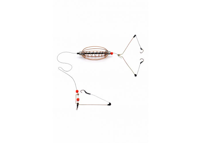 Универсальный карповый монтаж с кормушкой "арбуз" и тремя острыми крючками – готовый донный монтаж ручной работы, конструкция которого состоит из кормушки "арбуз", двух крючков на коромысле и одного крючка на отводе.